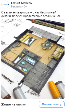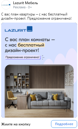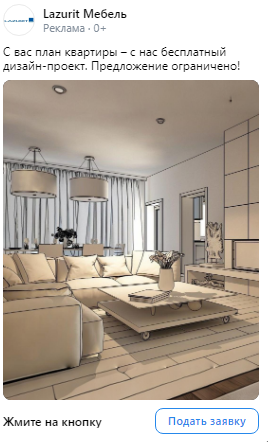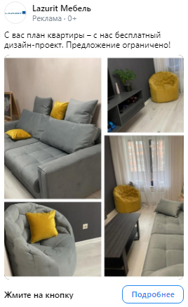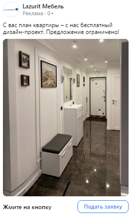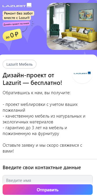 Работали с лид-формами, где ограничение на текст — 220 символов. Мы тестировали короткие тексты с различными заголовками. Для креативов использовали фотографии мебели Лазурит, стоковые изображения дизайн-проектов, а также дизайнерские работы, выполненные в цветовой гамме клиента (согласно его брендбуку)